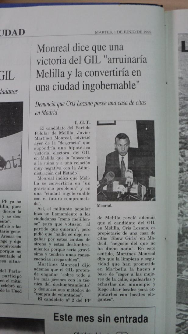Entonces una encuesta de un diário local anticipba el desastre, pero no en las proporciones en las que habría de desencadenarse. El PP de Velézquez ni siquiera fue el partido mas votado. Quedó el 3º tras el GIl y CpM, a la que siempre las encuestas vaticinan dos o tres diputados y siempre saca como mínimo 5. Aquél año, el de 1999, Mustafa Aberchán por una nuevo capricho del destino se convirtió en el primer imazighen que volvía a la Alcaldía de Melilla, tras la expulsión del último alcalde rifeño en 1497, tras la llegada de los españoles a Melilla.