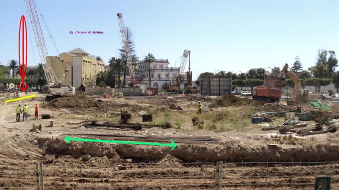 En atención al comentario de SinRumbo, incluyo esta otra fotografía del solar de Isla de Talleres, en el que ya ha empezado la excavación en serio. En la zona marcada con una línea amarilla en el lado izquierdo, la perforadora en forma de pinza de cangrejo sigue culminando el muro pantalla a 20 mts. de profundidad, y en la zona más próxima a nosotros, marcada con una linea verde, ha empezado el desmontaje de la zapata de hormigón que servía de cimientos a la zona de talleres, del poliddeportivo y las áreas de ocio. Una vez retirada la losa de hormigón, deberán excavar hasta los referidos 20mts, una profundidad nunca vista en Melilla y la orden será no detenerse ante nada, no mirar al suelo cuando se mete la pala excavadora.