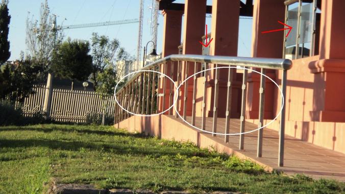 El Parque Forestal fue inaugurado hace cuatro años, por lo que no parece mala cifra que los embellecedores y protectores de las barandillas hayan aguantado casi un lustro. Lo que resulta desconcertante es que una vez que se advirtió la ausencia del primer panel protector (de plástico transparente), no sólo no se detuviera el proceso de desapariciones, sino que éste apreció acelerarse. Desde que hice esta foto a principios del verano hasta ahora, la pérdida de protectores de la barandilla ha continuado a un ritmo constante.