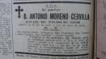 Los datos que ofrezco hoy, son apenas unos pequeñas trazas, que sitúan a Antonio Moreno como alguacil de los Juzgados de Nador, natural de Granada y fallecido a los 56 años. Vivía en la calle General Astilleros nº 50, en compañía de sus tres hermanos. Él era soltero y no tenía descendencia, pero la presencia desconocida y ya olvidada de sus tres hermanos, podría abrir la vía de la existencia de posibles descendientes, ya sea sobrinos u otro tipo de familiares. De hecho la esquela habla de tíos y sobrinos, aparte de los tres hermanos, como posibles líneas familiares a rastrear y que podrían aportar más datos sobre el enigma de su vida. Su tumba y culto, aunque en un segundo plano mediático, está a la altura del «soldado de los milagros».
