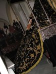 Desde el Lunes hasta el Jueves Santo,  la Virgen de los Dolores se encuentra expuesta, con su trono y manto procesional, en la nave lateral de la iglesia, fuera de la capilla en donde pasa el resto del año. Había quedado en Navidad con los encargados de la parroquia de San Pedro, para fotografiar a placer, en Semana Santa,  a la Virgen y a su manto, encontrándome y cerrando con este encuentro, una busqueda que había prometido culminar hace ya más de cinco años.