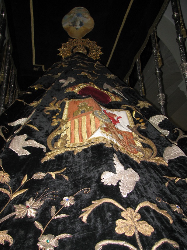 A pesar de sus 100 años de antigüedad, se ven como nuevas las espléndidas palomas bordadas que hablan del origen del manto, la Virgen de la Paloma de Málaga. Tiene un impresionante escudo de Alfonso XIII bordado en la espalda, que indica la secuencia temporal de su creación. El manto es largo y de una densa tela.  Su textura me recuerda a los tapices del Palacio Real de  San Ildefonso, en Segovia. Desprende el mismo aroma. Se nota el tiempo y las historias que acumula entre sus tramas.
