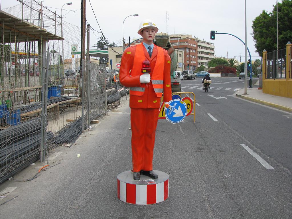 Por la calle Álvaro de Bazán se suele pasar rápido, más en este tramo, para que no te pille el corte del semáforo. A primera vista parece un trabajador normal, que da paso o aconseja desviarse a la derecha, para evitar la carga y descarga de materiales del edificio en construcción. Una visión más reposada, si se va desacelerando porque el semáforo ya está en rojo, permite comprobar que no es un trabajador, sino un muñeco a pilas o alimentado con energía solar. En la península, sobre todo en las autovías, es muy normal y habitual verlos, sin embargo, en Melilla ha aparecido hace apenas una semana, por este motivo, le llamo el trabajador de Mariano Rajoy, o el de la reforma laboral del PP.