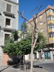 Nunca entendí por qué ciertos árboles en el barrio del Hipódromo estuvieron tapados durante dos años, ni tampoco se ofreció ninguna explicación. Tras ser destapados, su estado eran tan lamentable, que hoy dudo que tengan alguna posibilidad de existencia. La sensación es que se va podando o talando (no he conseguido decidirme qué opción se está llevando a cabo), cuando la copa de un determinado tipo de árboles aparece demasiado desordenada e invade el suelo, la calle o las casas colindantes, o sea, cuando afea el entorno de modo irreversible. No parece haberse buscado la creación de zonas de sombra, o una determinada estética en cada barrio. El estado de la arboleda ornamental melillense es de desorden absoluto y de mezcla total de especies.