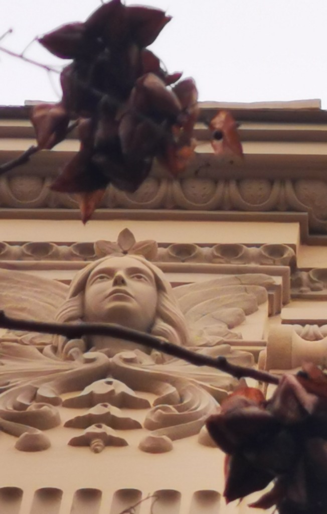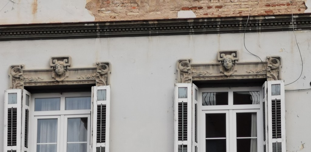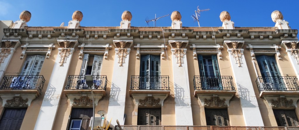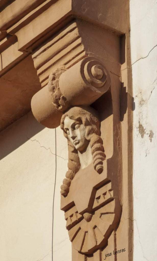Hay otros grupos de pequeñas figuras (victorias aladas y una divinidad oriental), en las calles Alonso Martín nº 15 y Carlos Ramírez de Arellano nº 13 (9 y 16 respectivamente). No hay figuras completas, salvo los niños colgantes del edificio Melul, en la avenida principal. Todas las caras miran hacia el frente, salvo algunas del edificio de La Reconquista, que miran hacia el Sol poniente y a su lado derecho. Algunas, las que están sobre los portales, parecen realizar una leve inclinación hacia adelante, como saludo o señal de respeto. Suelen estar situadas muy altas, en las columnas de las azoteas, y en las esquinas de los edificios, por lo que muchas no son conocidas.