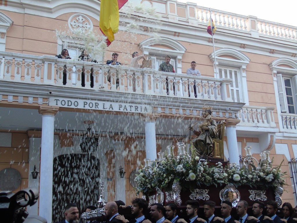 Hoy era todo inusual y extraordinario, hasta el recorrido, porque normalmente la imagen de La Victoria toma la avenida en sentido descendente, después de subir por López Moreno y girar por la Avenida de Castelar, desde que está alojada en la iglesia arciprestal del Sagrado Corazón. Cuando lo hacía desde Melilla la Vieja (hasta 2016), ascendía por la calle del Ejército Español y igualmente descendía por la avenida en su regreso. La imagen patronal ha tenido hoy un recorrido semanosantero pero en sentido inverso, yendo hacia la calle de Sidi Abdelkader y Luis de Sotomayor, pero en sentido contrario al de las procesiones de Semana Santa. Ha atravesado el parque y subido por la avenida, al igual que el Resucitado y el Rocío, por eso mismo, frente al balcón prohibido de la Comandancia de Melilla, en donde solo se celebra la Pascua militar y la ceremonia del izado y arriado de la bandera nacional, se ha lanzado una petalada a la Patrona melillense, que por su importancia histórica, comentaremos por sí sola.