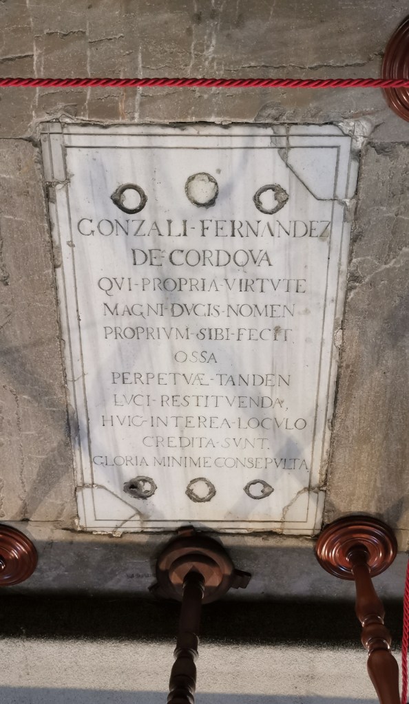 La suerte de los poderosos es distinta a la del común de los mortales. No debemos pues compadecernos o lamentar que se les olvide, ni convertirlos en aquello que no fueron. Ni enaltecerlos en demasía, ni tampoco denigrarlos, salvo que se deba ajustar sus figuras y hechos a la verdad histórica real, y no a la legendaria. En 1503, sus tropas infligieron dos grandes derrotas a las fuerzas francesas en Ceriñola y Garellano, que están directamente relacionadas con el saqueo de su tumba en 1812, por parte del general francés Horace Sebastiani, cuyas tropas usaron como cuartel y caballerizas el Real Monasterio de San Jerónimo, desde la ocupación en 1810. Conocedor de que en su escudo de armas figuraba la leyenda de «vencedor de franceses y turcos», decidió profanar la tumba del Gran Capitán (1453-1515) que había permanecido inalterada desde su enterramiento en la Capilla Mayor, recién iniciada la segunda mitad del siglo XVI, tras ser trasladado desde su primer enterramiento en el convento de San Francisco en 1552.