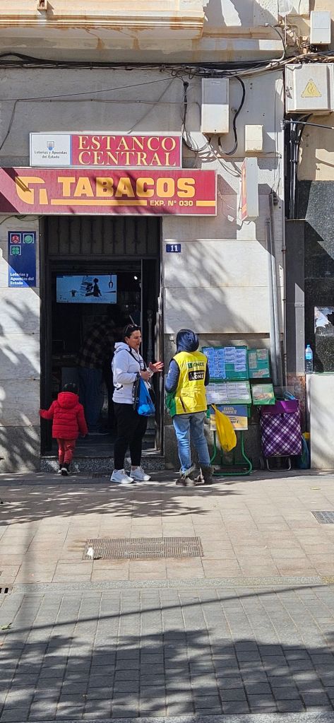 En una de las ocasiones pudimos fotografiar al delegado actual de ña ONCE, hablándolo con la trabajadora afectada , y tomando nota de la falta de condiciones laborales del quiosco. La trabajadora titular, y otros nuevos, tienen sus puestos de trabajo en plena calle, expuestos a todos los rigores de la climatología melillense, sin protección alguna, o sea, a la intemperie. Todavía no está explicado el motivo del segundo traslado, desde la calle Chacel a la plaza de Héroes de España.