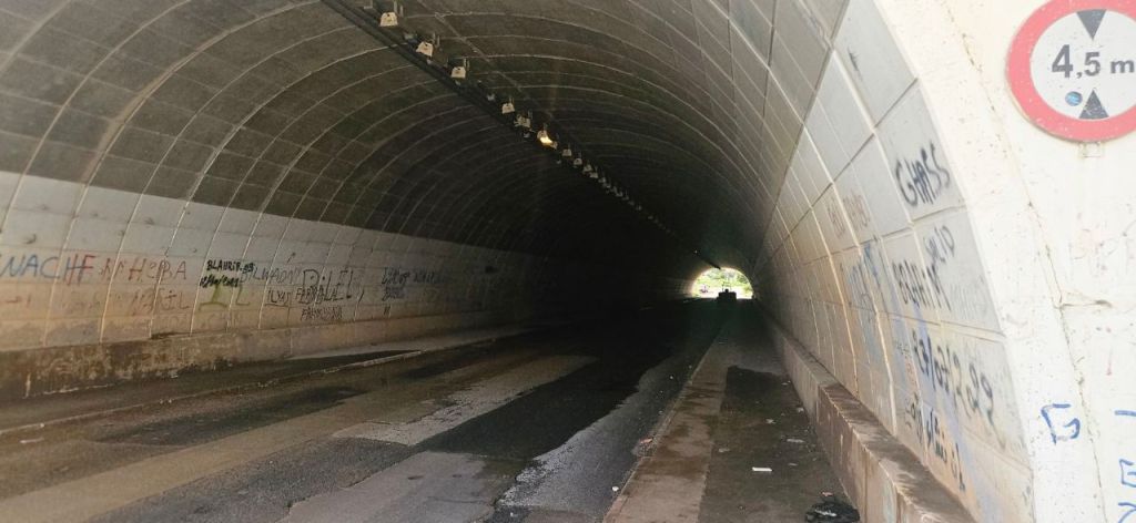 El paso por el túnel es tremendo,  porque se pasa de la luz diurna a la oscuridad más absoluta. La señalizacición en el interior no existe, cuando es obligatoria. No hay pintura reflectante en los bordillos de las aceras, ni en las paredes del túnel. No hay pintura vial, ni bandas de señalización, pero por no haber, no hay ni luz. Y no la hay, no porque la desidia urbana se haya olvidado de cambiarlas, de mantenerlas, o de que existen, sino porque ni siquiera hay lámparas,  pues han sido robadas,  extraviadas o sustraídas. Solo queda una solitaria luz encendida, que no iluminar absolutamente nada.