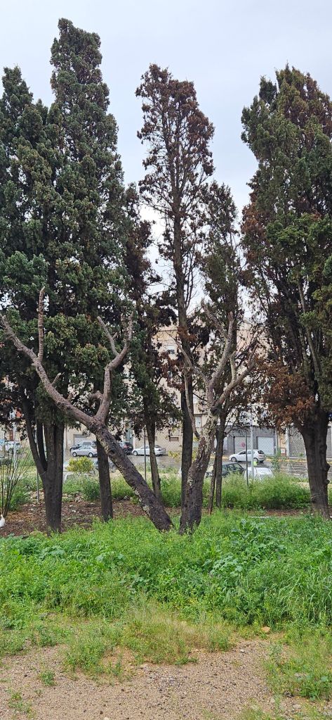 Formaban un conjunto de 21 árboles, entre pinos, ficus y cipreses. Hoy sólo queda la mitad. En 2022 pasó por la zona el agente naranja de las obras, y lo arrasó, pese a las advertencias. En la mitad restante, la que pudo salvarse de la quema, dos cipreses empiezan a tener el característico color del final, ese tono anaranjado que se asemeja a Marte, cuando se divisa en el cielo.