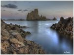 Para la presente entrada, cuento con dos fotos artísticas de Manuel Flores, mi cuñado, realizadas a pie de mar y que recogen perfectamente la magia y la leyenda del paraje. En un día en el que las brumas que envuelvan el arrecife, las fotos resultarían sobrecogedoras. Quizá Ulises nunca llegó tan lejos en su odisea, pero quién sabe.