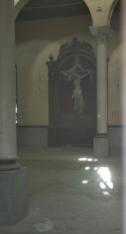 Nubes de polvo en suspensión recorren la nave vacía, lo que dificulta la observación y la fotografía. El interior solo puede ser observado a traves de rendijas, de alguna lama de madera ya desvencijada o de algún cristal roto. Esas son y serán siempre las puertas del Alminar. En apenas este tiempo ya ha habido varias intrusiones en el interior abandonado del barracón, antaño iglesia de Cristo Rey del Universo. Ya lo dijo un pontífice romano: el humo del diablo se cuela por cualquier rendija. Su humo es muy fino, tanto como es polvo que se levanta y anula los intentos de hacer fotografías nítidas.