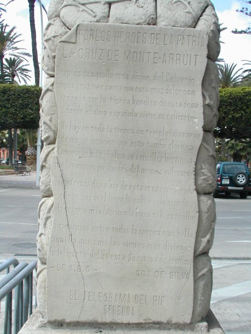 Durante la etapa del Protectorado, existió un camposanto en Monte Arruit al que se conocía como La Cruz, en donde reposaron los restos de los soldados españoles entre 1921 y 1950. Esta piedra o monolito, es un reproducción realizada por El Telegrama del Rif para conmemorar aquel luctuoso suceso. No se trata de la piedra original que cubría los restos de los españoles. El texto puede verse actualmente en el Mausoleo de Las Campañas de África, sobre la cripta que alberga a los enterrados en Monte Arruit. Se trata de un poema firmado por Goy de Silva y publicado en el diario ABC.
