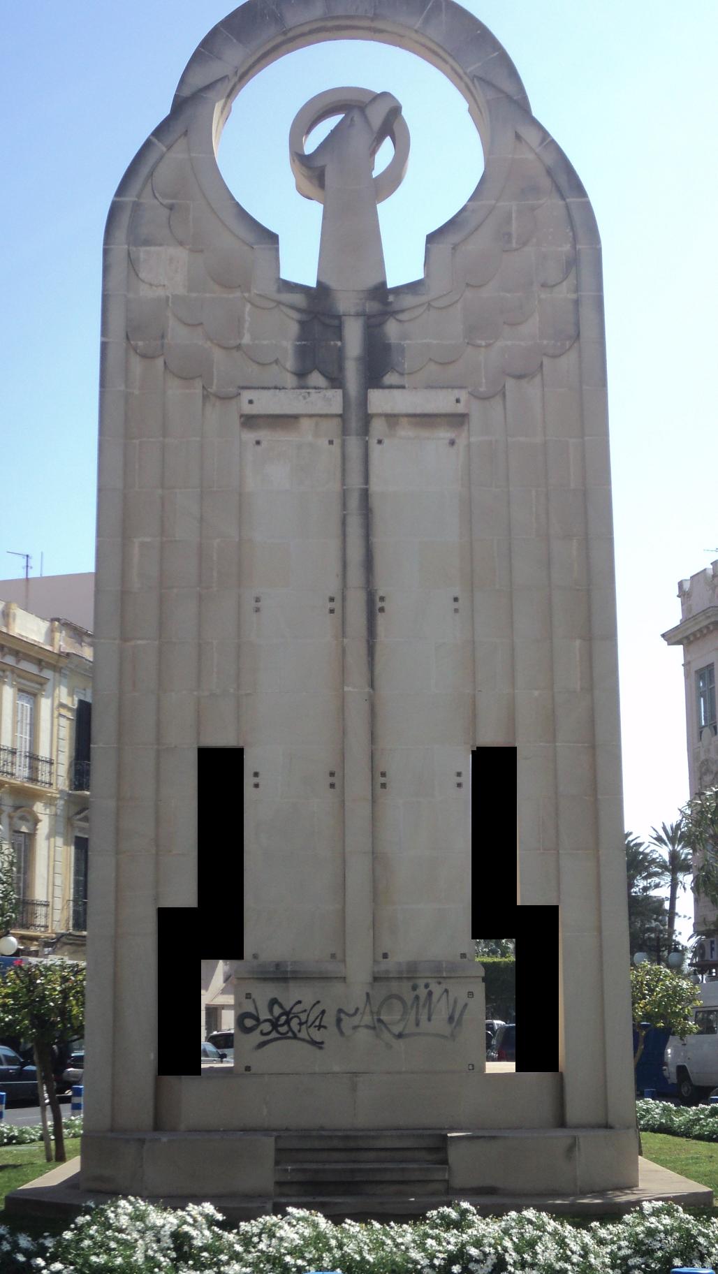 En 2002, cuatro integrantes del Cocissfra, fuimos juzgados, bajo la acusación de haber pintado de malva, el monumento de la Plaza Héroes de España. Tres fuimos absueltos y solo uno fue condenado. Pagamos costas y multa. El caso es que dentro de la campaña de concienciación, editamos un folleto en el que dábamos forma a nuestra teoría de que la runa sigel, está encubierta bajo las alas del águila de San Juan. En la foto con la que ilustrábamos el texto, puede apreciarse que «la sigel», también puede dibujarse o representarse de modo recto, lo que la asemeja aún más, al diseño del monumento, ideado por el arquitecto Enrique Nieto, reconocido y prestigioso miembro de Falange.